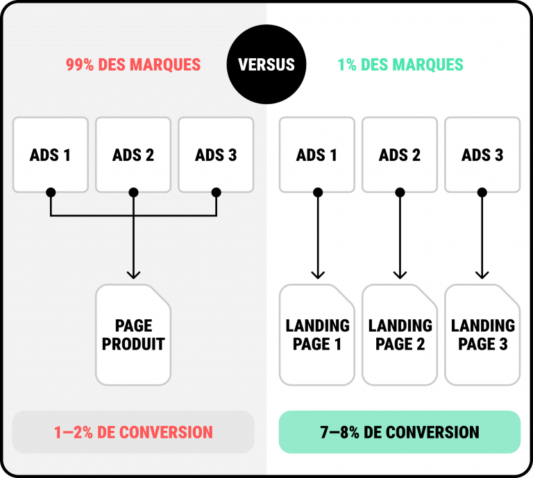 La pluspart des marques e-commerce, SAAS ou de génération de leads font une erreur qui leur coûte 30% de leur performance. Ils dirigent le trafic de leurs publicités vers des pages produits.
