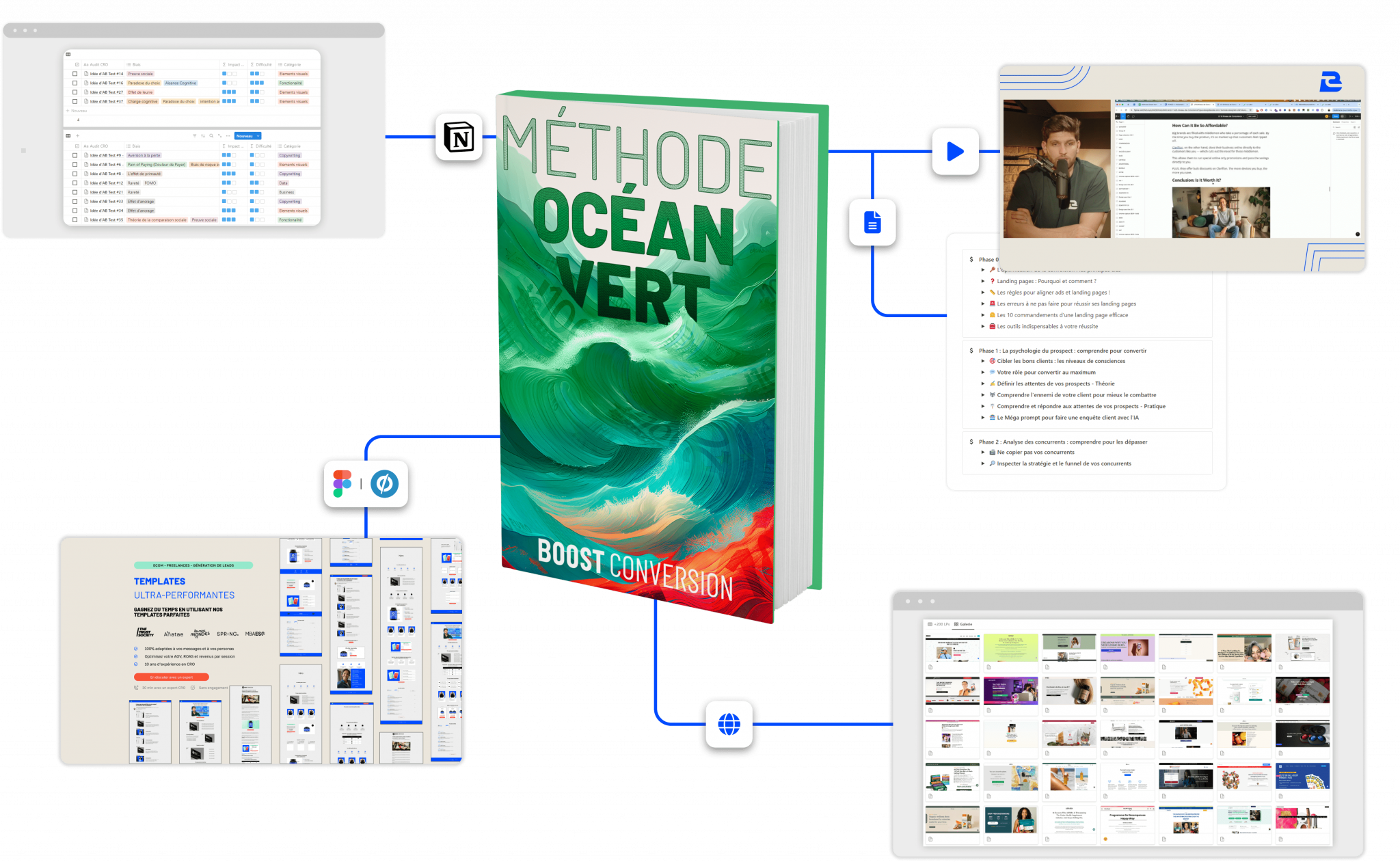 Nul besoin de compétences techniques ! Vous n’avez pas besoin d’être graphiste, expert en CRO, en UX, ou copywriter. Nous avons tout mis en place pour que vous puissiez appliquer la méthode Océan Vert sans aucune compétence préalable. Vous pourrez utiliser nos templates, nos prompts, nos tableaux… La méthode a été conçue pour qu’un débutant comme un expert puisse créer des landing pages en un temps record.